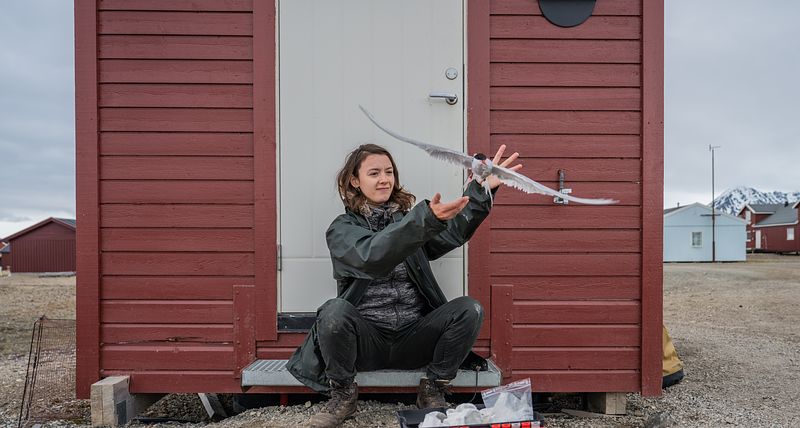 Frigg Speelman releasing Arctic terns with geolocators in Ny-Ålesund, Svalbard
